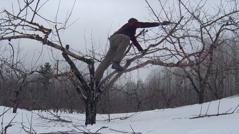 Waldeier has positioned his GoPro in some strange places: on shears he used to prune an apple tree (below), on the steering wheel of a cross-country ski trail groomer, in a pot into which he was ricing potatoes, on the scoop of an excavator he used to pull tree stumps out of the ground. It’s not surprising, then, that his GoPro has been subjected to more than a fair share of abuse.