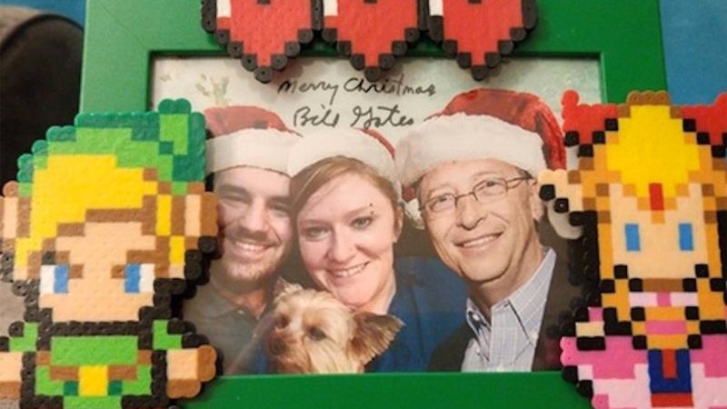 But the funniest gift in the box was a beaded Zelda-themed picture frame (he knew from her profile that she loves to bead). Inside the frame was a photo of her family with Gates added in. She wrote, “The picture in it is just the best…he used my profile picture on here of me, my husband, and my dog, PHOTOSHOPPED HIMSELF IN, and put Santa hats on all of us! Come on now, that is the cutest thing!”