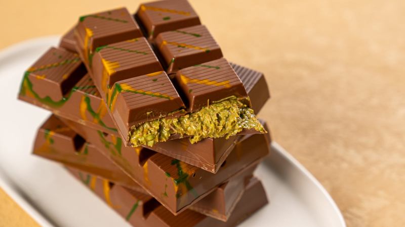 Dubai chocolate in the candy bar form has been dominating the food space on TikTok since last summer. The sweet treat is made with milk chocolate stuffed with a creamy pistachio and knafeh (or kunafa, a crispy, shredded phyllo pastry) filling.