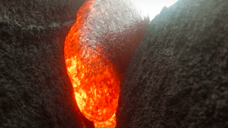 That “something” was his high-tech camera bursting into flames as it was engulfed by flowing lava. It was totally destroyed…or was it? After the lava cooled, Storm hacked the GoPro out of the rock. The device itself was indeed roasted, but the footage survived. Check it out in the incredible video above.