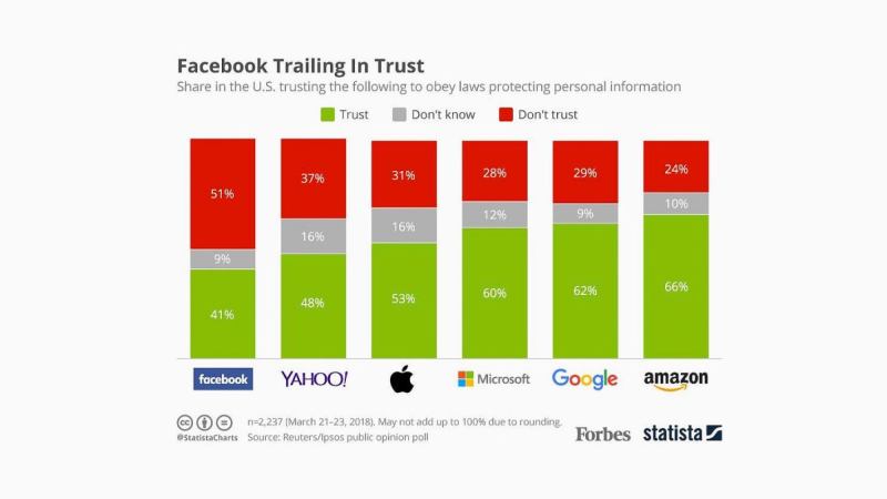 According to data from Forbes and Statista, 51 percent of consumers do not trust Facebook to obey laws protecting personal information.