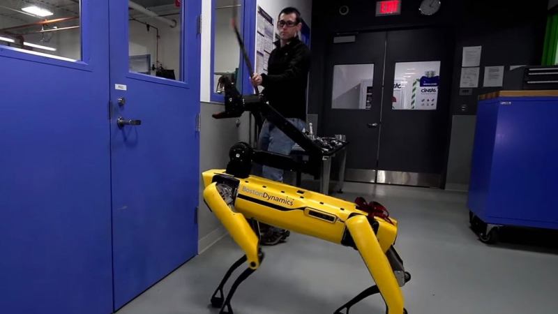In the video below, spotted by TechCrunch, you’ll see a Spot Mini being remotely piloted by an off-camera human and then given the “Go” command to open the door. Another Boston Dynamics’ employee then whacks the Spot Mini with a hockey stick, slamming shut the door it just opened before yanking back on a lead attached to its rear end.