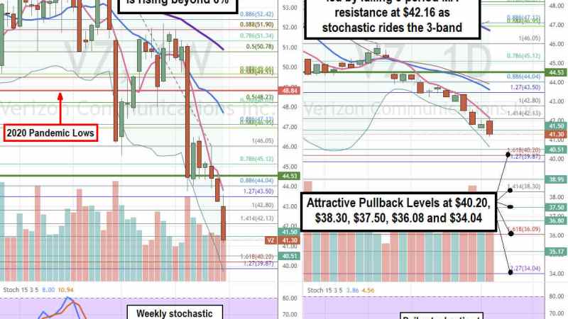 Using the rifle charts on the weekly and daily time frames provides a precision view of the landscape for VZ stock. The weekly rifle chart inverse pup breakdown triggered on the breakdown below the $50.78 Fibonacci (fib) level. The 2020 pandemic lows of $48.84 were broken as shares continue to plunge as the weekly 5-period moving average (MA) resistance falls at $43.81 followed by the 15-period MA at $47.73. The weekly lower Bollinger Bands (BBs) sit at $39.72 as the weekly stochastic form another mini inverse pup under the 20-band. The weekly 50-period MA is falling at $50.89. The weekly market structure low (MSL) buy triggers on a breakout through the $44.53 level. The daily rifle chart downtrend has a falling 5-period MA at $42.16 followed by the 15-period MA at $43.62 with lower daily BBs at $40.62. The daily stochastic is very oversold as it hovers near the 3-band. Attractive pullback levels on this ugly stock sit at the $40.20 fib, $38.30 fib, $37.50, $36.09 fib, and $34.04 fib level.