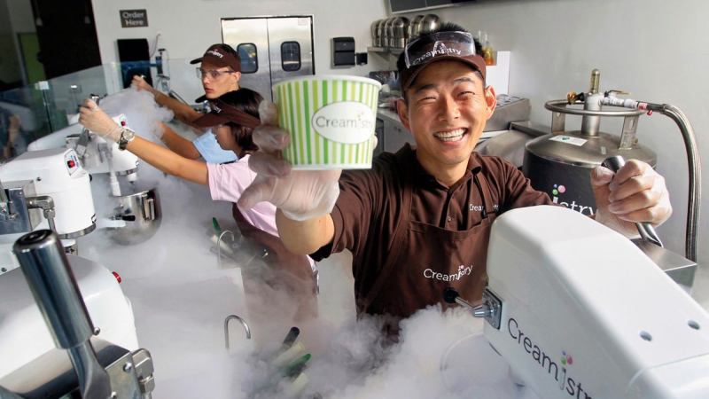 Years later, Yim decided to follow suit and open an ice cream shop. He knew he needed to stand out, so he thought back to a unique street vendor he’d seen in South Korea. He was selling ice cream made with liquid nitrogen, which flash-freezes creamy mixtures to produce an ultra-smooth treat and a playful smoke show that delights customers. After two years of tinkering and testing in his garage, Yim perfected his formula and opened the first Creamistry store in 2013 in Irvine, Calif. Today there are more than 50 locations across four states and three countries, and Yim expects to open 100 stores in China over the next three years.