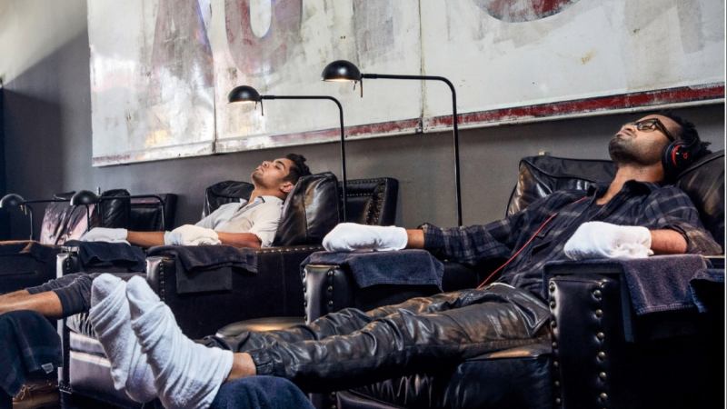 Needless to say, this is not your mother’s nail salon. Customers enter a high-end man cave, where they’re seated in overstuffed leather chairs, each outfitted with Beats or Sony headphones and a flat-screen TV (with remote, of course). There’s a selection of beer, whiskey and soft drinks to sip while technicians scrape off callouses; trim, file and buff nails; and massage rough skin.