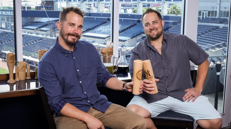 The agency role fell apart at about the same time he was fired as a waiter. With no money for rent, he was living very literally in his sister’s backyard. It was then he recalled an idea he’d tucked away while coaching. Why not turn the barrel of a bat into a drinking mug? It was not a dream or a vision, but the simple recollection of watching a fellow coach creating an apparatus for a “focus on the hands” hitting drill. To bring his point home, the coach had cut off the top of the bat and left it on the bench while the players worked with the handle. The thought hit Thompson like a bit of lightning: “I could easily create a way to serve a drink from a bat.” It seemed simple enough. Now that he had nothing else going, why not give it a try?