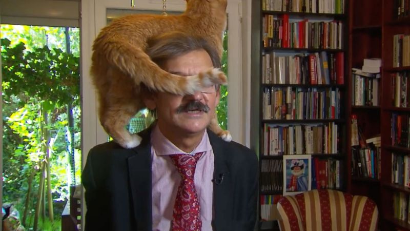 Polish historian and political scientist Jerzy Targalski was giving an interview to a Dutch news show when Lisio, his orange tabby cat, leaped up on his shoulder, curled his tail in front of Targalski’s face and proceeded to lick his left ear. Targalski didn’t miss a beat, continuing on with his comments as if nothing had happened.