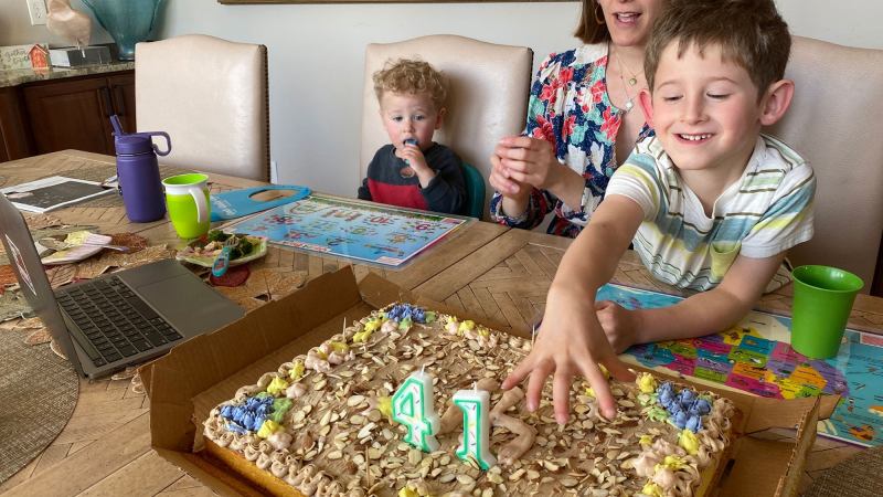 Our cake arrived in Colorado a few days later. The box was surprisingly heavy, and we couldn’t imagine what the weight was from. Then we opened the box and figured it out: The heaviest thing in there was a gigantic tub of frosting, which could easily cover three cakes. They also included candles that say 41!