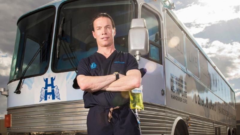 Tying one on: In 2011 Burke attempted to launch a business administering IV meds for hangovers from a location across from the Hard Rock Hotel & Casino. The financial realities of real estate on the Strip put an end to that. However, while driving around the city, he hit upon the idea of offering his services on the go, via bus. Hangover sufferers would get a remedy faster, he theorized, and he’d minimize his overhead. Nevada officials saw no problem with the plan, and in 2012 Burke launched Hangover Heaven in a 45-foot bus.