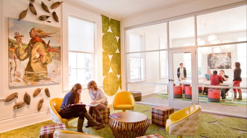 We all love a beautiful view, but in a workspace, pleasant vistas are almost always an invitation to distraction and daydreaming. As one designer memorably told me, “Windows belong above the kitchen sink.” In my own office, I have arranged most of the seating turned away from the windows, which face east. Over the center of the windows hangs a suitably large painting, letting in just enough of the fantastic Lowcountry light to do its work. For the university’s recent micro-housing project, we created windows that allowed residents to adjust transparence at will, obscuring the view when they need extra privacy or deep focus.