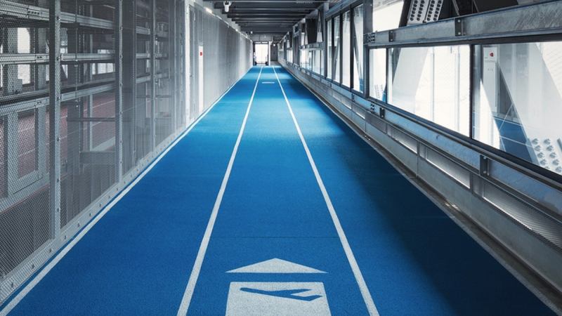 Japan’s largest airport rolled out the sporty upgrade last week as part of the promotional and logistical runup to the 2020 Summer Olympic Games in Tokyo. The clever floor designs, which look and feel pretty much exactly like the typical shock-absorbing rubberized tracks used in track and field, come in brick red and sky blue.