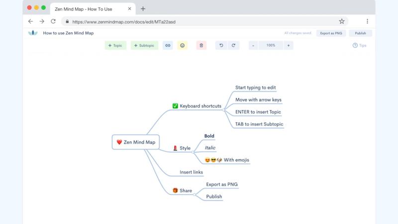 The minimal, modern, and capable interface design is a breeze for anybody to use, whether you’ve used mind maps before or not. You can make your mind maps more memorable with emojis, use pre-existing mind map examples and templates to help you develop a framework, and publish live mind maps that automatically update whenever you make changes. Downloading, exporting, or publishing documents as a PNG is also simple, allowing you to share your process with other people.