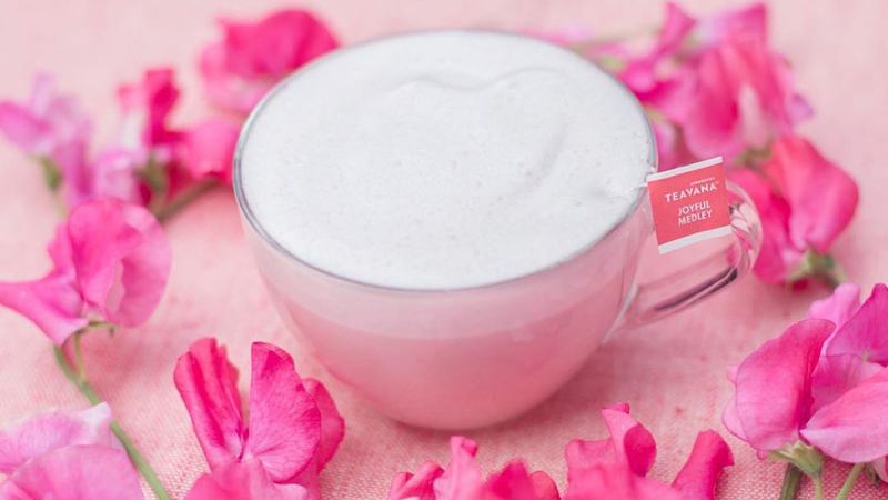 The pastel drink contains steamed milk and a blend of Teavana jasmine tea called Joyful Medley, which is flavored with orange, peach, apple and strawberry.