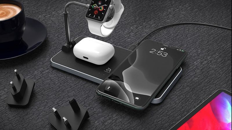 This charging station is a triple fast wireless charger that works with Qi-compatible Apple products like iPhone X, Apple Watch, and Apple AirPods Pro, as well as other Qi-compatible devices. The charger offers dual charging standards of 7.5W for Apple and 10W for Android to ensure all of your devices charge safely at the right pace. Plus, it has a 24W fast wall charger with US/EU/UK travel plugs to let you connect while traveling across Europe. The charging dock offers 100 percent safe charging with protection against overcharging, overheating, and detecting foreign objects.