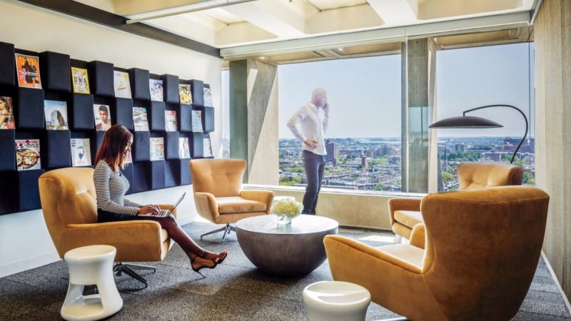 Business District is for professionals who care less about free beer and more about the flagship office’s brag-worthy home in an I.M. Pei-designed building. Matt LoGuidice founded the Boston-based company after time spent overseeing his East Coast property management business out of a shared space in Los Angeles. “I couldn’t find a center that occupied the niche I wanted — a center that feels more like a boutique hotel,” he says, explaining his design sense. “We might be the only center of its type in the country where every office has an adjustable-height Herman Miller desk.”