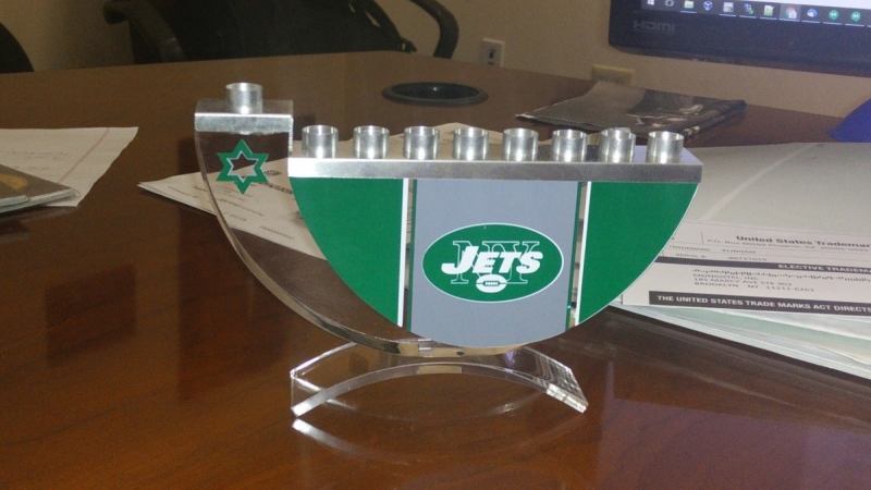 The total “gift package” consisting of the Jets menorah, a box of candles, and the letter: