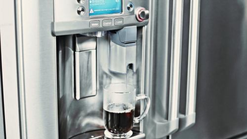 Tech GE Reveals a Fridge That Serves Up Piping Hot Coffee Forget getting ice from your fridge. Check out this video of a refrigerator that uses Keurig K-cups to deliver your caffeine fix. By Kate Taylor
